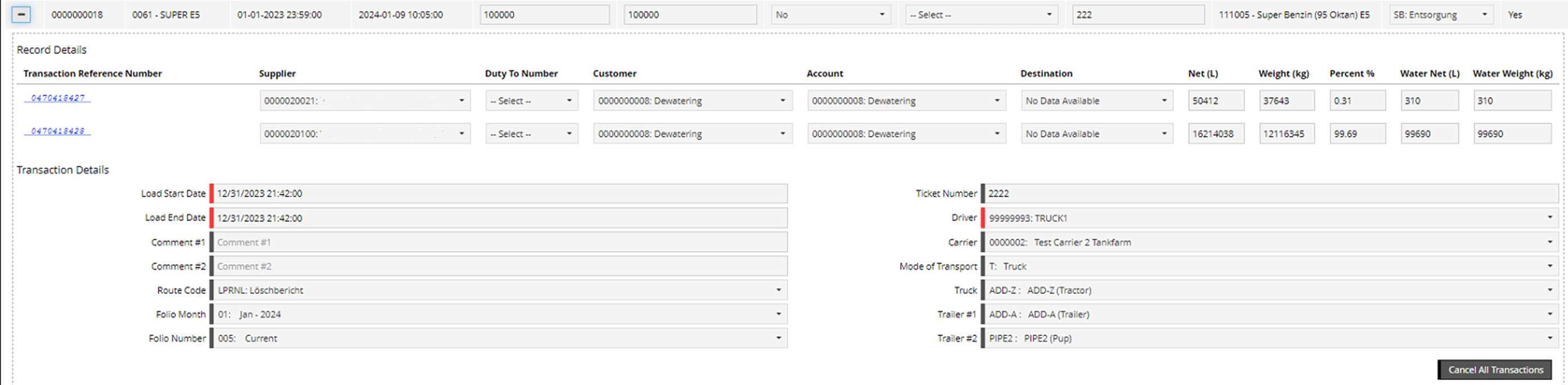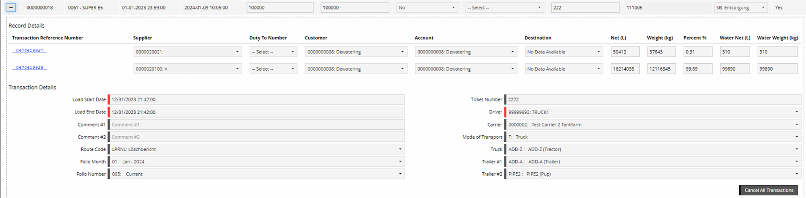 Once the record is added, you can select the '+' icon to view the Record Detail and Transaction Detail view for the record. The Record Detail view will display all suppliers who have product in the tank and what net volume and weight of product and waste they are responsible for; all of the totals of these values for each supplier must equal the total Net and Weight values in the record header.