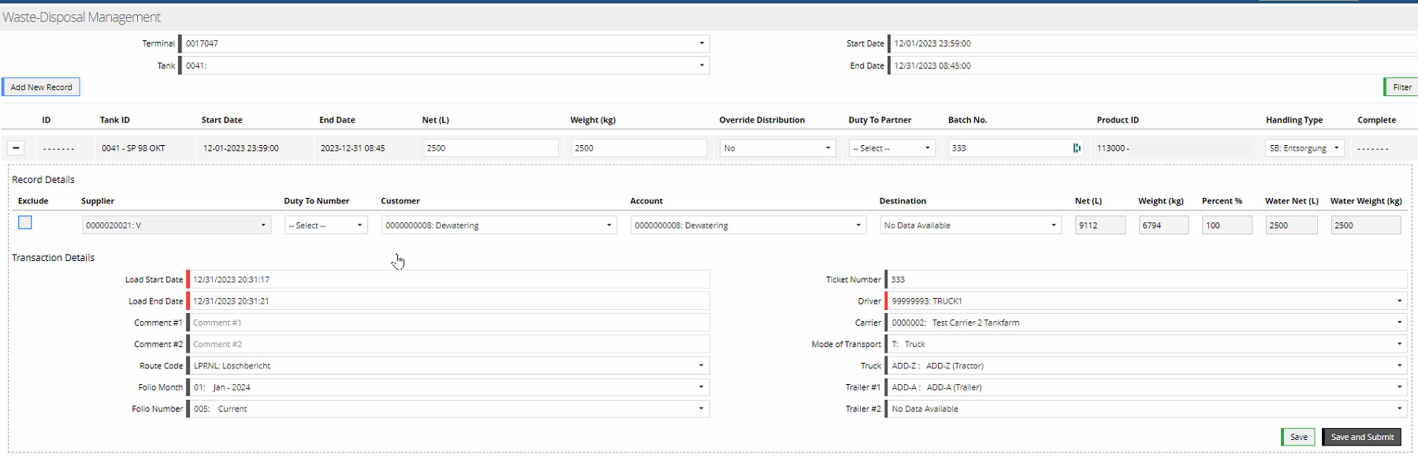 | Save and Submit | Selecting this button will save and submit the record, will trigger TMS to process the waste disposal transaction. |