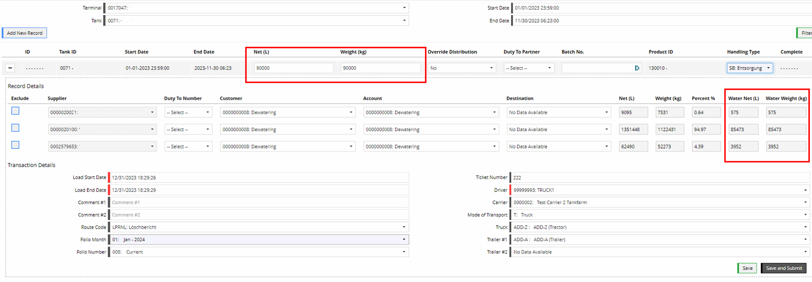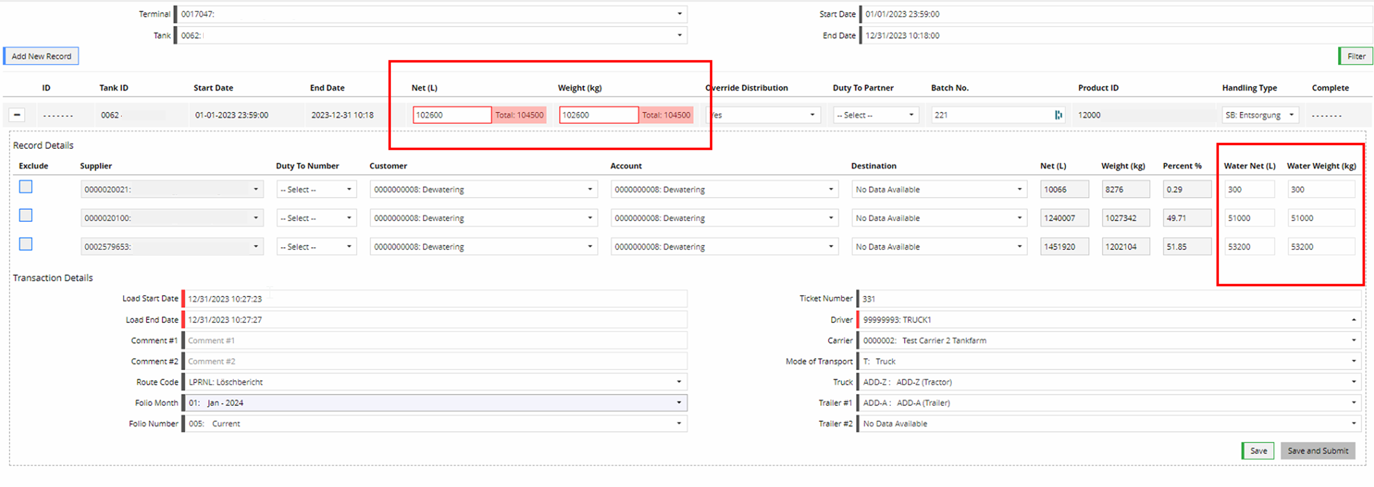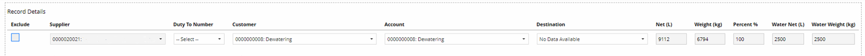 | Water Weight | The weight of waste this supplier is responsible for as it relates to the total waste weight for the tank; all Water Weight fields for each supplier in the Record Detail view must total to equal the total Weight in the Record View header Net field. |