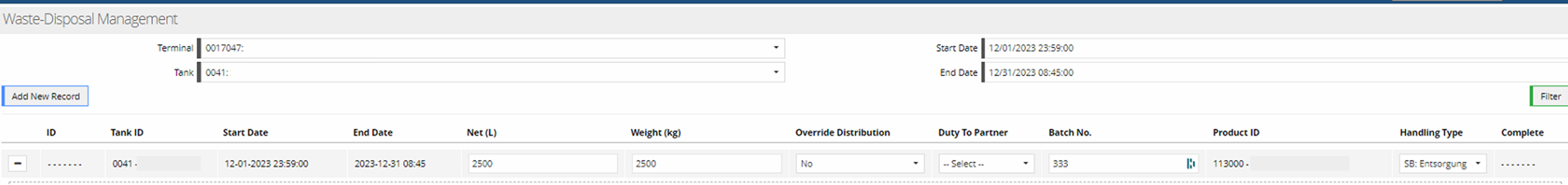 You can also start a new waste disposal record if none exist. To do this, you must first use the filter fields to select a terminal, tank, and date range. After defining these fields, you can select 'Add New Record' to begin a new waste disposal transaction.